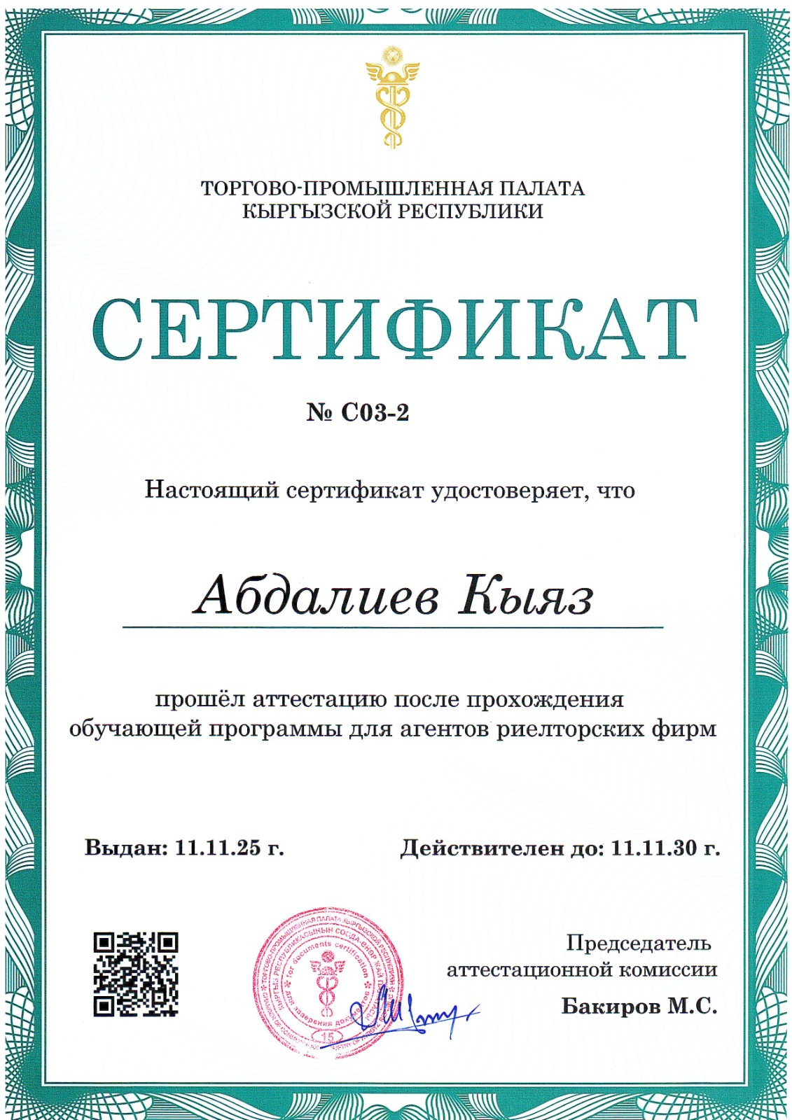 Регистрационный номер сертификата о прохождении аттестации: № C03-2