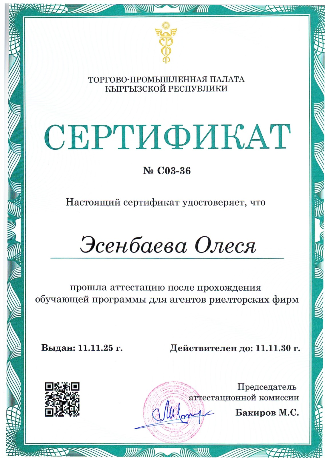 Регистрационный номер сертификата о прохождении аттестации: № C03-36