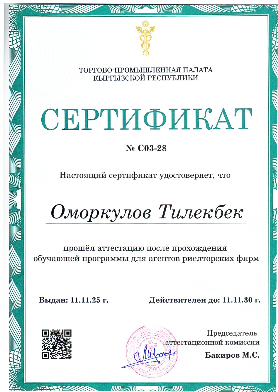 Регистрационный номер сертификата о прохождении аттестации: № C03-28