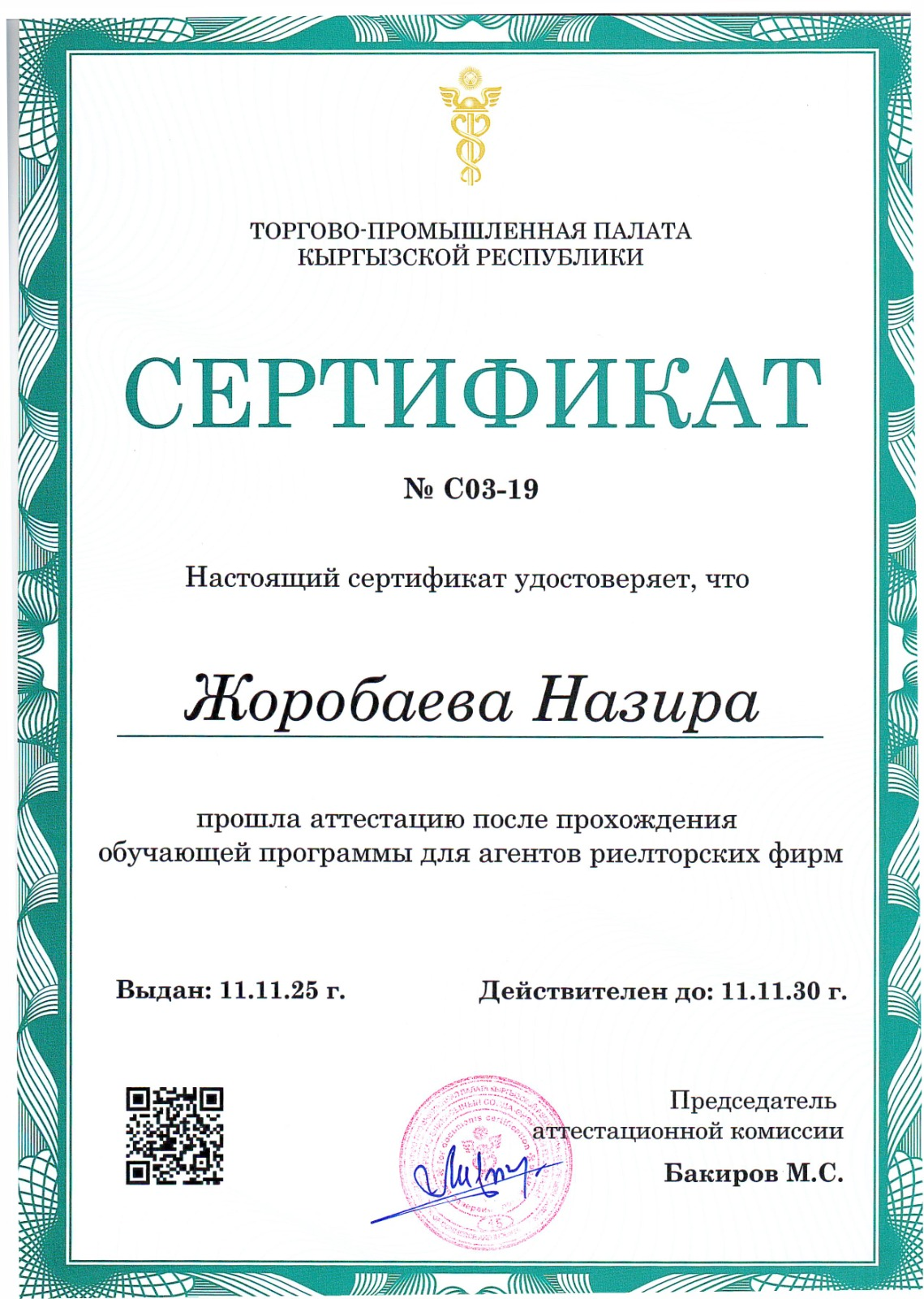 Регистрационный номер сертификата о прохождении аттестации: № C03-19